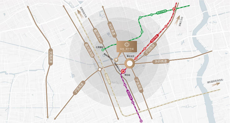 5轨 :轨交1号、5号、12号、嘉闵线(建设中)、市域机场线快:沪金高速、沪昆高速、沈海高速、外环高速、嘉闵高架路。