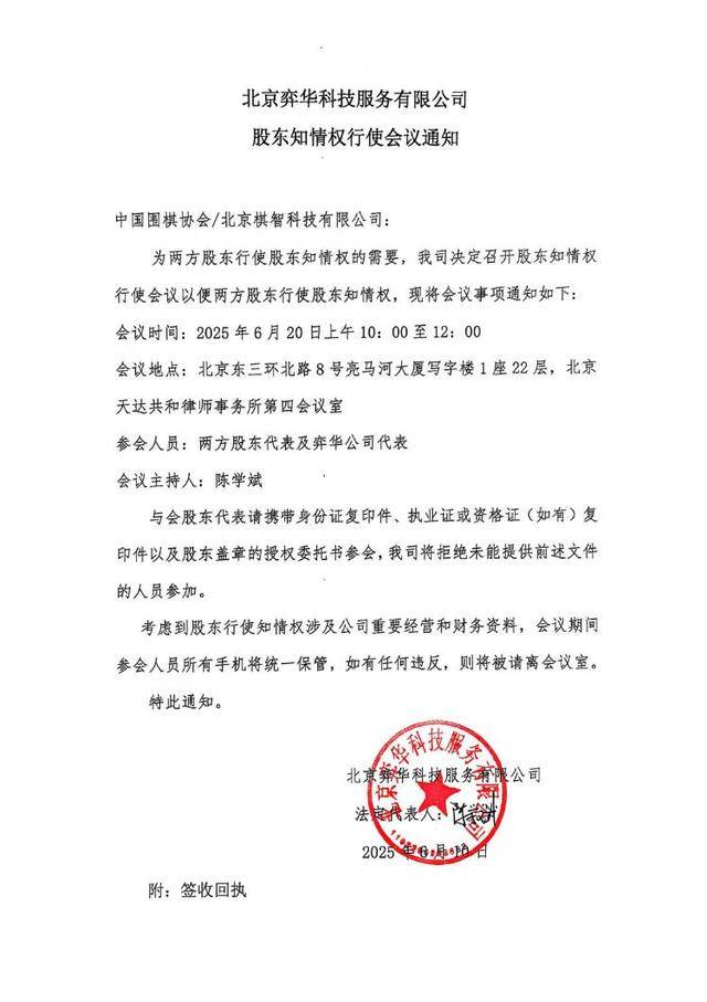 2025年5月28日,棋智公司向弈华公司发去《关于行使股东知情权之通知函》,6月10日,弈华公司回函称愿意配合棋智公司行使股东权利,并于2025年6月20日上午10:00至12:00安排了一次特别会议。“两个小时怎么够查看那么多文件,所以我们再次发函要求他们配合。”由小川表示,“第二次发函后弈华公司称我们没有参加6月20日的会议,就是放弃了权利,近期他们不会再安排相关事宜。”