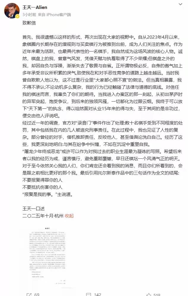 王天一在道歉信里说:“经过快一年的调查,官方对‘录音门’有了处理结果:几十名棋手都受了罚,轻重不一样,我也在里面,还被追究了刑事责任。”