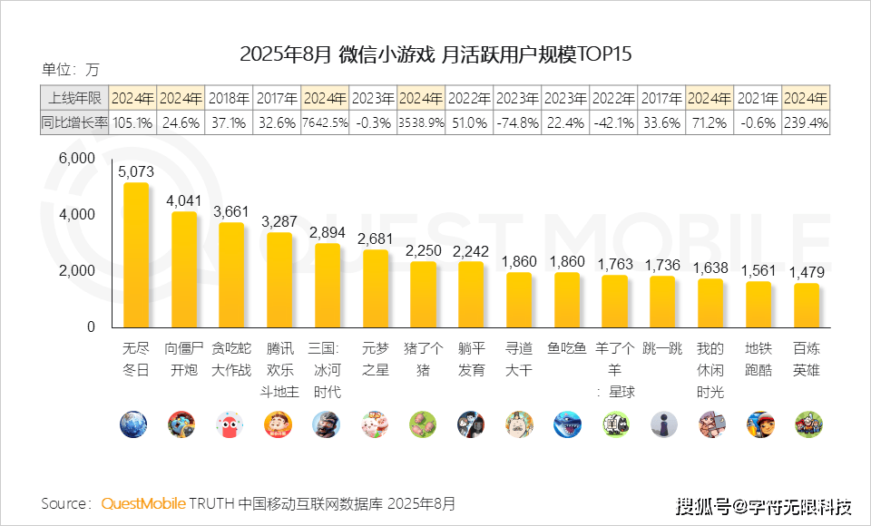 老牌产品如《贪吃蛇大作战》《跳一跳》依旧保持千万级月活,而《无尽冬日》(月5073万)《向僵尸开炮》(月活4041万)《三国:冰河时代》(月活3661万)等新作则通过融合轻度休闲与中重度玩法,实现用户规模快速提升,反映出“中度化玩法”正成为微信小游戏增长的关键引擎。