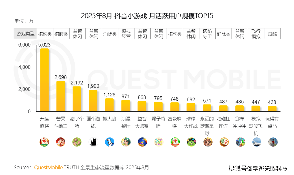 棋牌与益智类表现突出,《开运麻将》月活达5623万,《芒果斗地主》《猪了个猪》等产品月活也均超千万,显示出短视频平台在游戏分发与用户转化上的高效能力。
