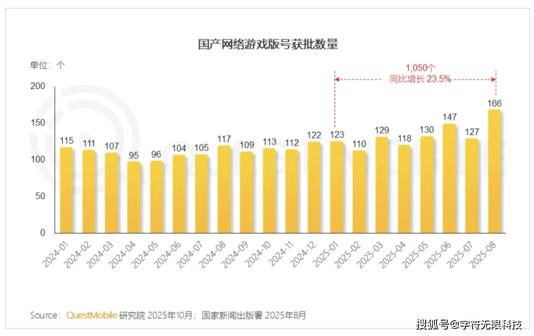 QuestMobile数据显示,截止到2025年8月,国产游戏版号过审数量达1050个,同比增长23.5%,行业精品化与高质量发展趋势明显。
