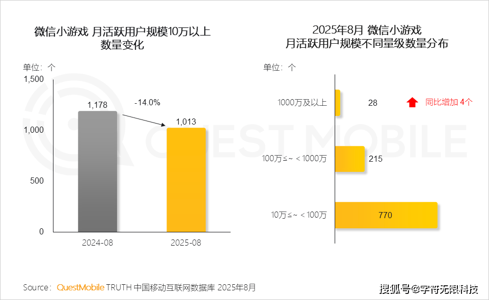 微信小游戏市场在竞争加剧的同时,结构持续优化。千万级月活产品增至28款,十万级产品成为中坚力量,显示出市场仍为中小开发者留有空间。