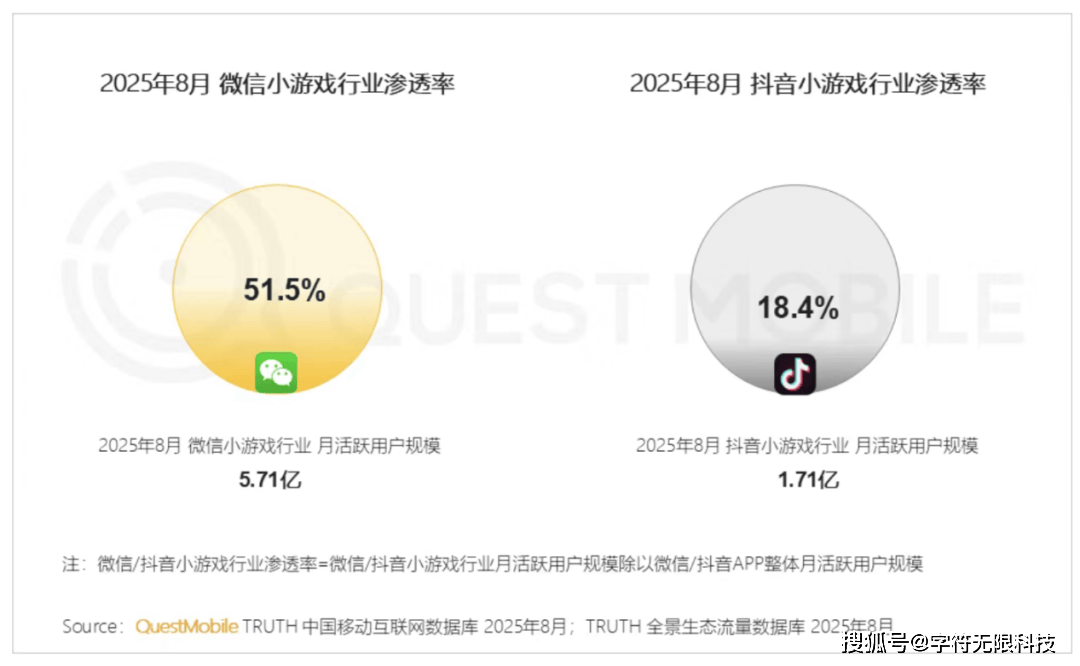 值得注意的是,小游戏生态快速崛起,与手游形成“双端互补”格局。其中,微信小游戏以51.5%的渗透率和5.71亿月活用户领跑,抖音小游戏则以18.4%的渗透率和1.71亿月活紧随其后。