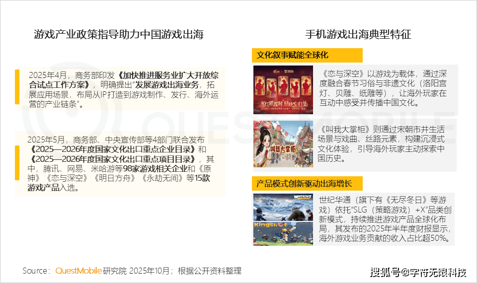 文化出海新模式:在政策引导下,游戏企业通过文化叙事与模式创新驱动海外增长,形成“政策—文化—模式”良性循环。
