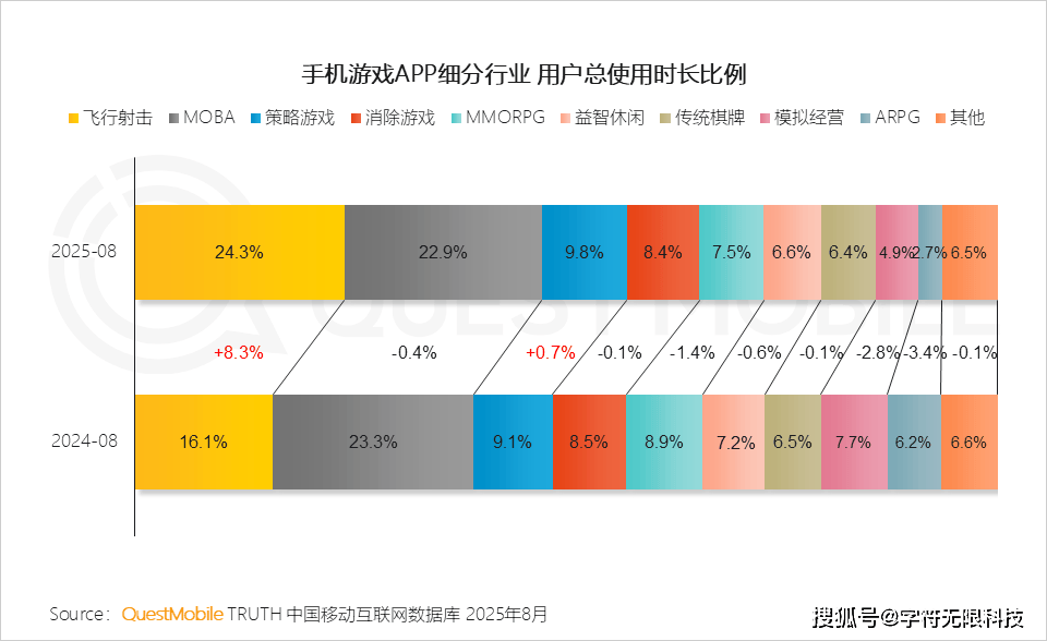 在手游领域,竞技类与策略类游戏持续占据用户时长主导。飞行射击、MOBA、策略类游戏在新增游戏的推动下,时长份额进一步上升。