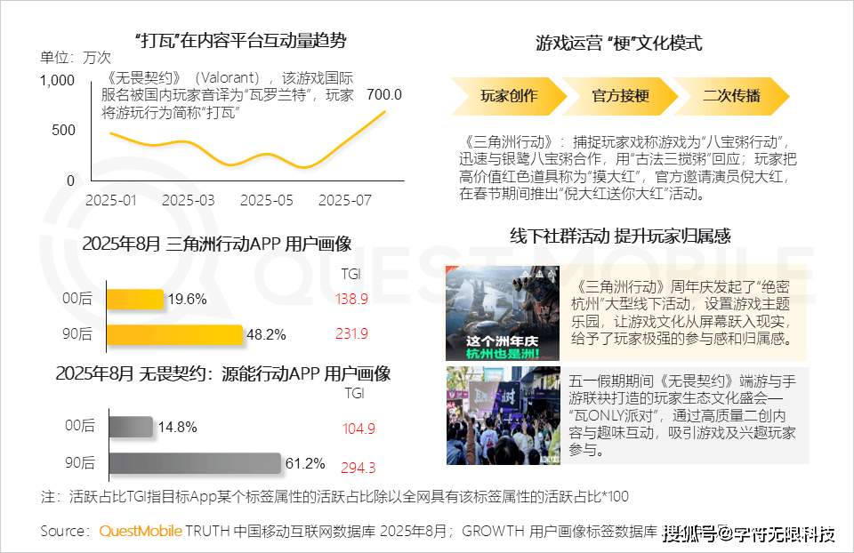 同时,玩法创意与社区运营成为吸引年轻用户的关键。《三角洲行动》与《无畏契约:源能行动》通过梗文化、玩家共创与线下活动,构建高互动性游戏生态,00后与90后用户合计占比分别达67.8%与76%。