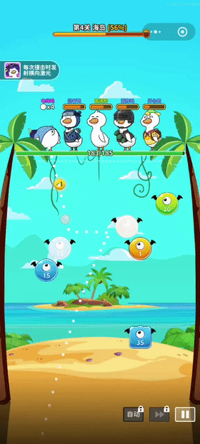 《超能下蛋鸭》则在沿用百搭的塔防和卡牌养成玩法基础上,特别加入了还没有在榜单上“刷屏”的弹珠作为核心亮点。颇有考量的弹道设计加上“连锁弹射、连击清屏”机制,搭配夸张的弹射特效和音效,瞬间把爽感拉满。此外,萌趣十足的鸭子英雄形象能快速吸引玩家目光,丰富的技能搭配设计也保证了阵营组合的策略深度。最终经过多次优化调整,该游戏成功跻身弹珠射击类小游戏的头部行列。