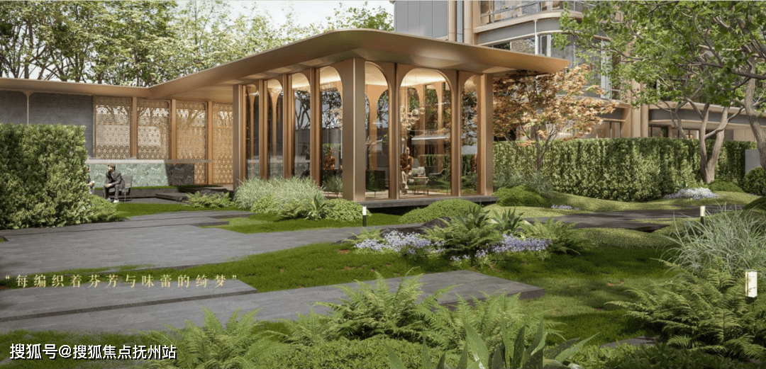 近百米中央会客花园,涵盖迎宾水景、廊下书吧、休闲茶吧、会客花园、棋艺天地等功能分区,营造业主共享的社交场景。