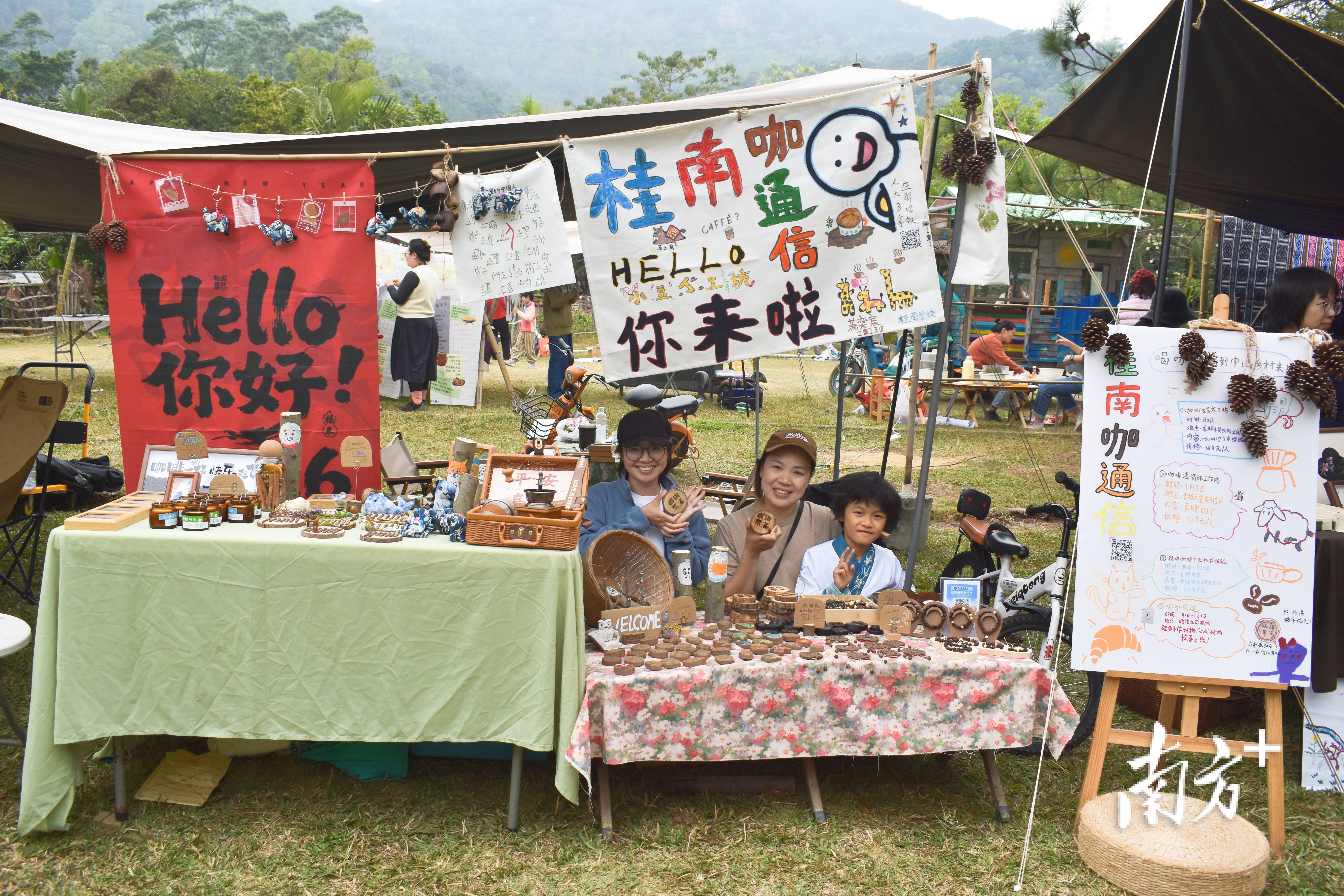在“桂南咖通信”摊位前,来自市区的游客看着孩子亲手串制的咖啡豆手串,发出由衷赞叹。摊位上,咖啡香薰、咖啡豆日历、咖啡渣香牌、咖啡皂等手工艺品琳琅满目,这些是由桂南小学亲子家庭共同创作的作品。