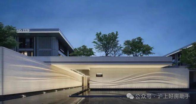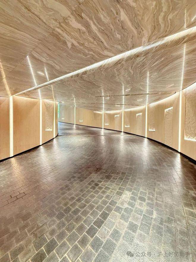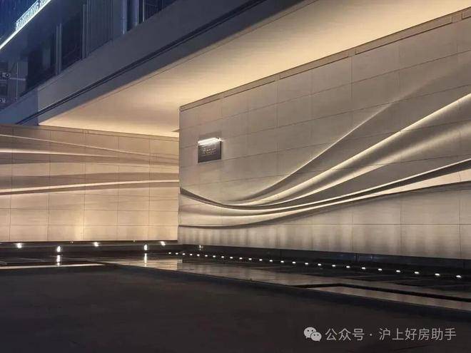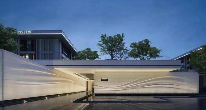 采用米黄色温润石材,巧妙模拟风的流畅形态,营造出既庄重又舒适的归家氛围。这片宽广的流线型石墙在柔和灯光的映衬下,更显璀璨夺目,而风雨连廊的灯带设计,更添一份尊贵仪式感。