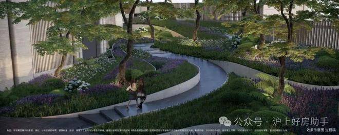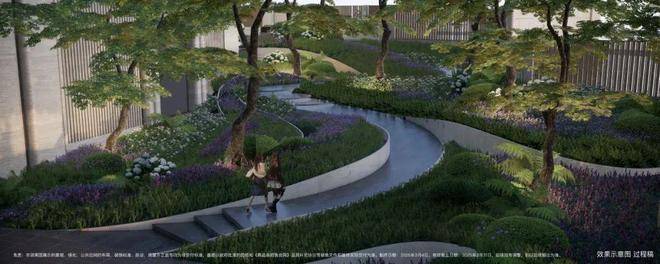 小区做了抬高处理,整体抬高,最高处超过7米,整个小区形成了错落的格局,在小区内部做台地景观。所谓台地,便是将小区内地面整体抬高,与市政道路形成一定的高度落差,这样建造的社区气势磅礴,居高临下。通过景观设计,将小区景打造成了立体台地花园,