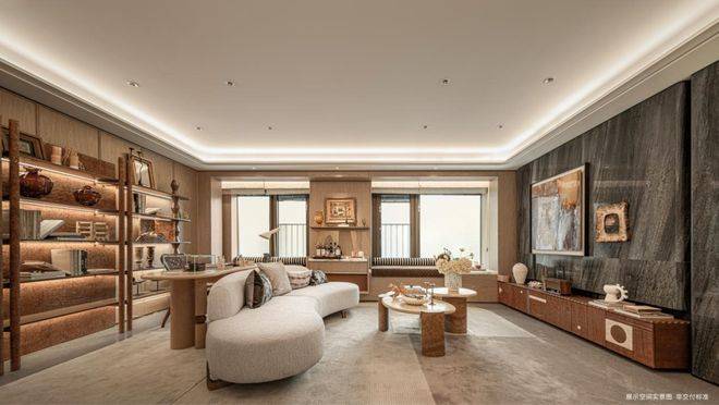 墙面,严选安第斯雪或晓山青珍贵石材,与木饰面、特色定制墙布组合设计;客厅、餐厅、卫生间等区域地面定制石材,赤足走过,温润细腻的触感。