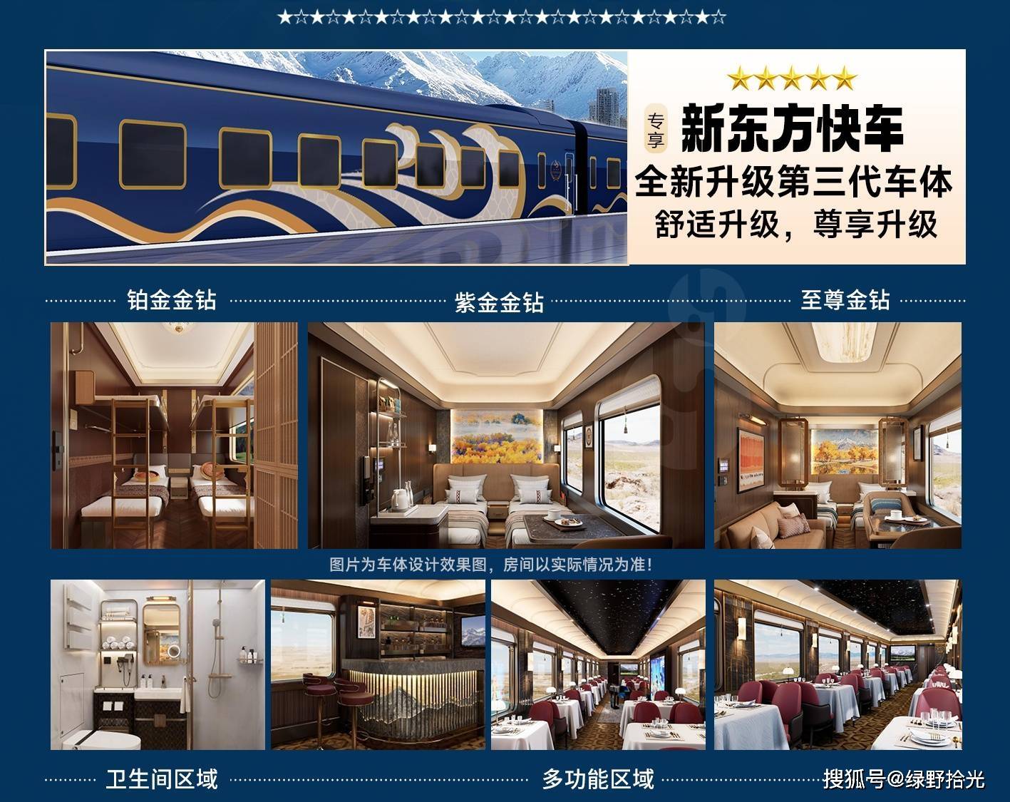 2026 年新东方快车车厢配置:全品独立卫浴,多元房型选择,列车全长18节,含载客车13辆(含至尊三包车1辆、紫金四包车5辆、铂金五包车7辆)、厨房车1辆、餐车1辆、功能车1辆、宿营及发电车各1辆,定员186人(灵活载客116-186人),每间客房均配备独立卫生间与淋浴房,实现 “洗漱自由” 的旅途体验: