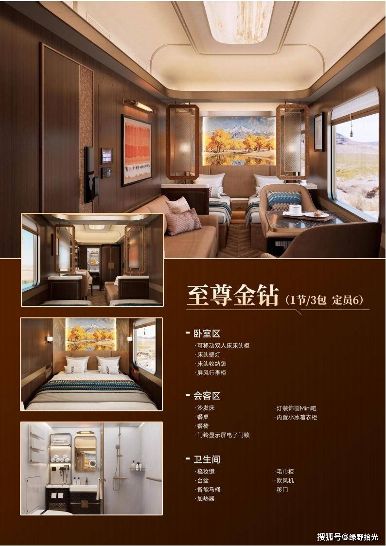 新东方快车配备 1 节至尊金钻车厢,该车厢设有 3 间客房,核定载客 6 人,为乘客提供奢华宽敞的空间。车厢内分区明确,设有卧室区(配备可移动大床或标准床以及屏风行李柜)、会客区(设有 mini 吧、定制衣柜、沙发床和餐桌椅)、干湿分离的卫生间(配备智能马桶、品牌淋浴用品和吹风机),能够充分满足高端客群对于私密社交和舒适体验的需求。