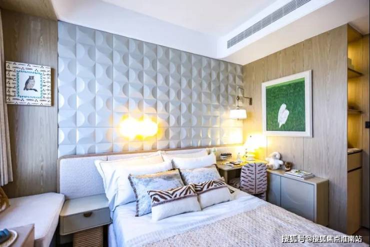 其中边户的主卧套房更是点睛之笔,配备270度转角飘窗,将天空与城景化为日常背景墙,更大拓展了空间感与居住心境。背景墙采用皮革硬包与实木圆弧造型拼接,搭配异形拼花地板,氛围温馨典雅。