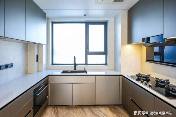 厨房为U型布局,配备博世四件套厨电,包含三眼灶、油烟机、洗碗机、蒸烤一体机,还有科勒抽拉龙头及日立厨房空调等高端品牌,中岛与飘窗休闲区相连,扩展了操作与互动场景。
