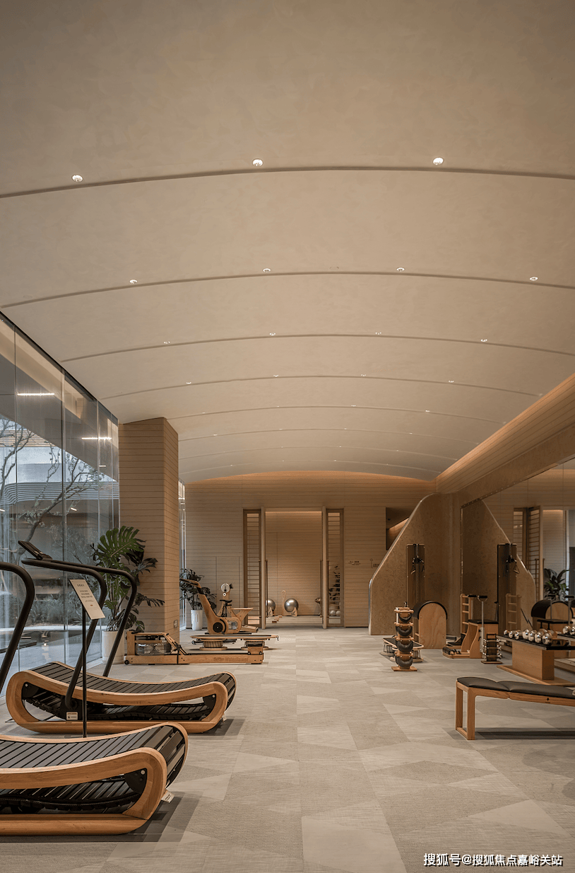 面向下沉庭院的墙体搭载大面落地玻璃,将灵动飞瀑、林荫灌木和自然光线引入室内,健身休闲之余亦可邂逅自然美景。