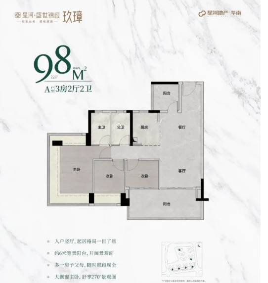 具体户型方面,98㎡户型全新升级,主朝向朝南,让阳光洒满每一个角落。主卧配备270°无柱飘窗,视野开阔,能够将周边美景尽收眼底;次卧和阳台尺度大幅增加,提供更加舒适的居住体验,无论是休闲娱乐还是晾晒衣物都更加从容,适合三口之家居住。