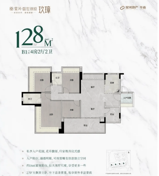 星河·盛世锦城目前主推三期【玖璋组团】的98-110-128㎡三至四+1房户型,共5个户型,均采用全新规设计,实用率高达100%以上,赠送面积显著增加,空间尺度更加开阔,为业主打造宽敞自在的居住环境。
