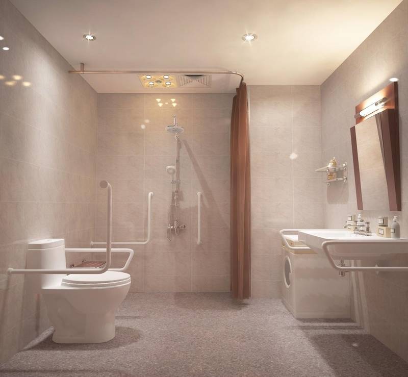 护理公寓:全屋护理床、防滑地板、墙面拉绳报警、毫米波雷达跌倒监测,浴室恒温花洒+助浴椅,适配失能长辈;