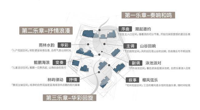 通过「潮起邀约」、「山水谷响」、「泳池派对」 、「椰风弦乐」、「林屿律动」、「鲲鹏海浪」、「雨林水韵」 等七大主题景观的层层递进,营造出移步景异、富有韵律的沉浸式体验,让每一次归家,都成为一场唤醒感官的诗意巡礼。