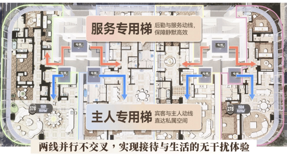 一梯一户电梯入户之外,另配置2部医疗级服务电梯,轿厢尺寸、载重能力精准契合担架、轮椅以及急救设备的通行需求,匹配铂金会所多功能使用场景